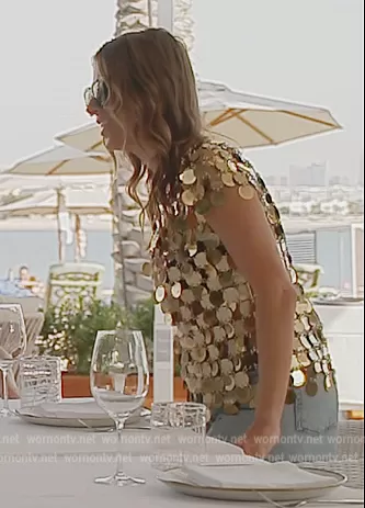 Juliet Angus's gold chainmail sequin top on The Real Housewives of Dubai
