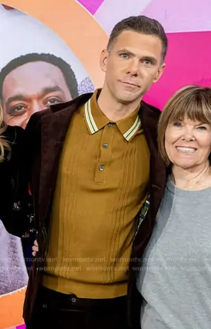 Noah's mustard polo sweater with striped collar on Nobody Wants This
