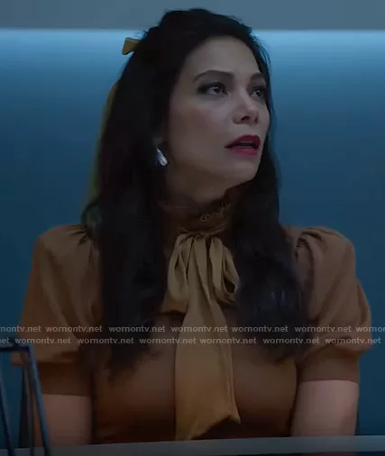 Helen's yellow puff-sleeve tie-neck top on True Lies