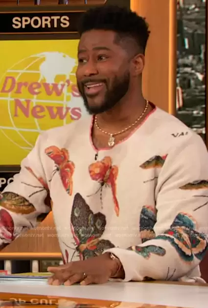 Nate Burleson's white butterfly print sweater on The Drew Barrymore Show