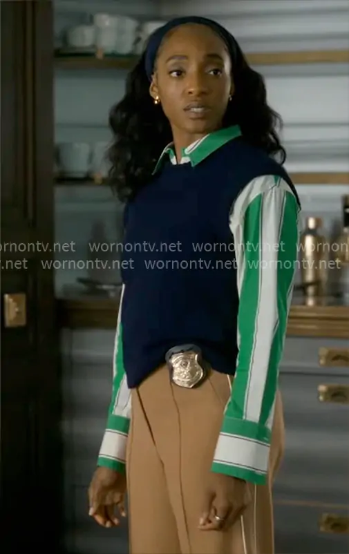 Faith's green striped shirt and camel pants on Will Trent
