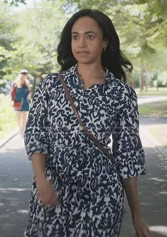 Francey's floral v-neck top and blue pants on So Help Me Todd