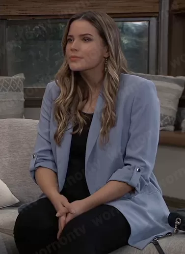 Lexi's purple blazer and blue floral skirt on Not Dead Yet